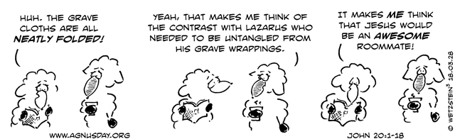 Early on the first day of the week, while it was still dark, Mary Magdalene came to the tomb and saw that the stone had been removed from the tomb. So she ran and went to Simon Peter and the other disciple, the one whom Jesus loved, and said to them, “They have taken the Lord out of the tomb, and we do not know where they have laid him.” Then Peter and the other disciple set out and went toward the tomb. The two were running together, but the other disciple outran Peter and reached the tomb first. He bent down to look in and saw the linen wrappings lying there, but he did not go in. Then Simon Peter came, following him, and went into the tomb. He saw the linen wrappings lying there, and the cloth that had been on Jesus’ head, not lying with the linen wrappings but rolled up in a place by itself. Then the other disciple, who reached the tomb first, also went in, and he saw and believed; for as yet they did not understand the scripture, that he must rise from the dead. Then the disciples returned to their homes.