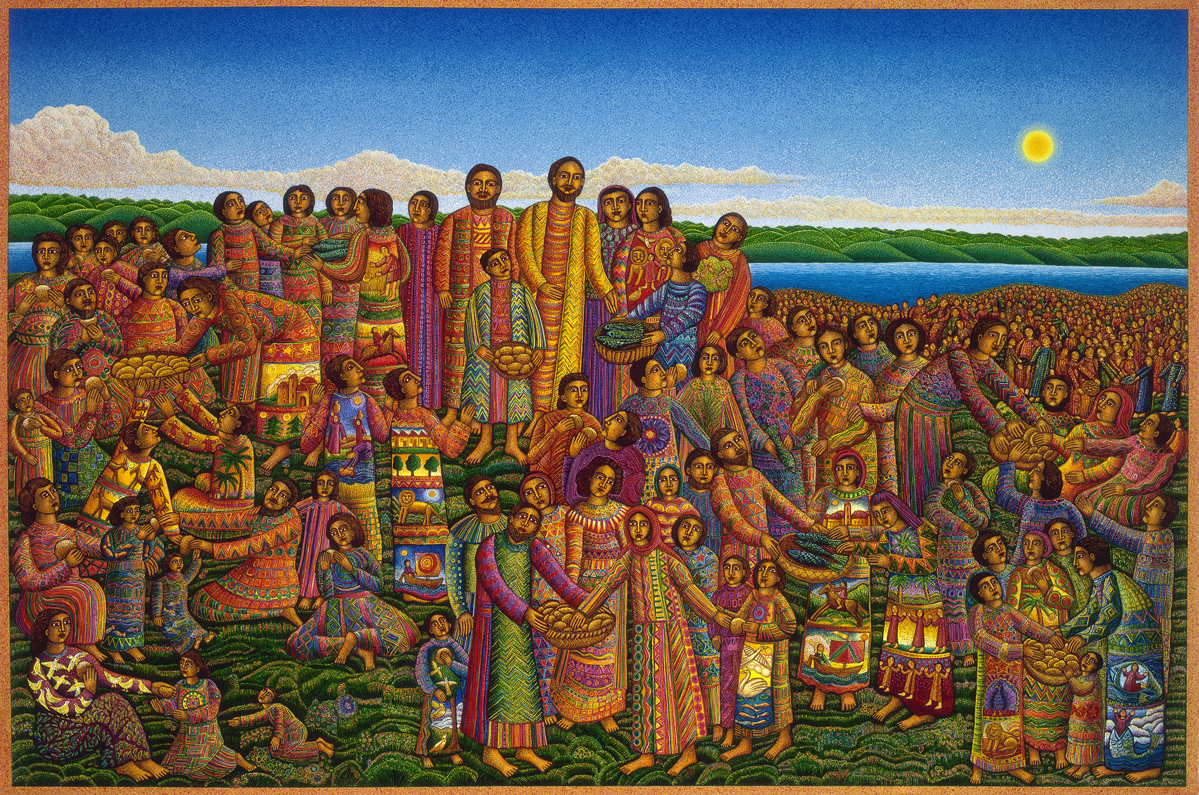 To purchase prints, cards, and posters of John August Swanson's works, visit http://www.johnaugustswanson.com Serigraph 24” by 36” Artist’s Notes: For many years I sketched, and tried to work out in my imagination, how the scene of the LOAVES AND FISHES, with its multitude of people, could be painted. I wanted this image to honor native peoples in many parts of the world; those who work the land for their livelihood, and have lived for generations in small communities or villages... The people in my painting are wearing garments with many colors and patterns, inspired by the creations of the makers of cloth, the weavers, and the dyers of Central America, Mexico, and parts of Africa and India... My image of LOAVES AND FISHES emphasizes and reminds us of the basic needs of all humanity. We all share the need for food and for providing for our families and communities. If we take the cosmic view, that there currently exists enough of what we need to sustain the world; we urgently need to consider sharing the resources that have been entrusted to us. JOHN AUGUST SWANSON makes his home in Los Angeles, California, where he was born in 1938. He paints in oil, watercolor, acrylic and mixed media, and is an independent printmaker of limited edition serigraphs, lithographs and etchings. His art reflects the strong heritage of storytelling he inherited from his Mexican mother and Swedish father. John Swanson’s narrative is direct and easily understood. He addresses himself to human values, cultural roots, and his quest for self-discovery through visual images. These include Bible stories and social celebrations such as attending the circus, the concert, and the opera. He also tells of everyday existence, of city and country walks, of visits to the library, the train station or the schoolroom. All his parables optimistically embrace life and one’s spiritual transformation. John Swanson studied with Corita Kent at Immaculate Heart College. His unique style is influenced by the imagery of Islamic and medieval miniatures, Russian iconography, the color of Latin American folk art, and the tradition of Mexican muralists. His art is in no way "naïve." It is detailed, complex, and elaborate. Unlike many contemporary artists, John Swanson works directly on all phases in producing his original prints. His serigraphs (limited-edition screen prints) have from 40 to 89 colors printed, using transparent and opaque inks creating rich and detailed imagery. For each color printed the artist must draw a stencil on Mylar film. This stencil is transferred to the silk screen for printing the color ink on the serigraph edition. The resulting serigraph is a matrix of richly overlaid colors visually striking and technically masterful. Mr. Swanson’s art is represented in the permanent collections of many museums, including three museums of the Smithsonian Institution: The National Museum of American History, The National Museum of American Art and The National Air and Space Museum. He is also included in the print collections of the Art Institute of Chicago, Harvard University’s Fogg Museum, the Tate Gallery and Victoria and Albert Museum in London, and the Bibliothèque Nationale in Paris. His painting THE PROCESSION is one of relatively few works by contemporary artists to be selected for the Vatican Museums’ Collection of Modern Religious Art. In 2008, an extensive collection of John August Swanson’s works were purchased by Emory University’s Candler School of Theology to hang on the walls of their new 76,349 square foot building. He was awarded The Dean’s Medal for his art’s transformative effect on the campus. With over 55 works hung, this is the largest open public display of the artwork of John August Swanson. [from the artist's website] |