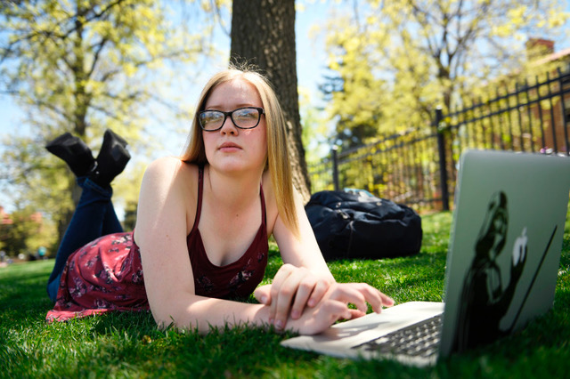 Murray, 19, studying on May 8, 2018 on Farrand Field for her last final as she
