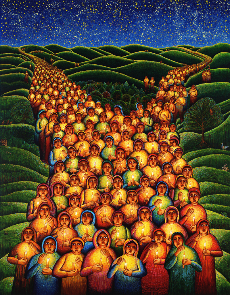 gradually becoming figures carrying candles as they come closer to the