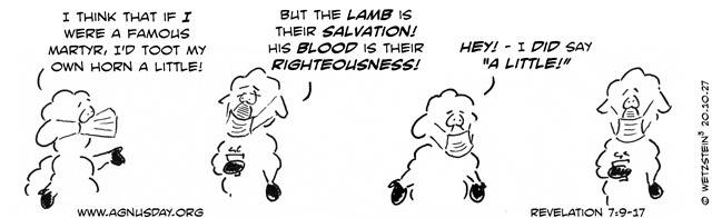 Lamb, robed in white, with palm branches in their hands. They cried out in