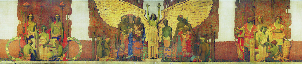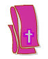 Mary, dressed in gold because she is the woman clothed with the sun, also wears a cape with green stars and blue crosses, which symbolize Bethlehem and Calvary. She is a little fearful of the news she has recently received herself, that she was pregnant with God’s child. But Luke tells us that she put her fears aside to be with her cousin Elizabeth and help her in her own miraculous pregnancy. Elizabeth’s bright and welcoming smile assures Mary, and us, that in God’s plans, everything always works out for the best. The tops of their halos form a heart which meets at the bottom in the wombs of the two women. The fluttering windsock behind them reminds us of the wind of the Holy Spirit, ever fresh, ever new.